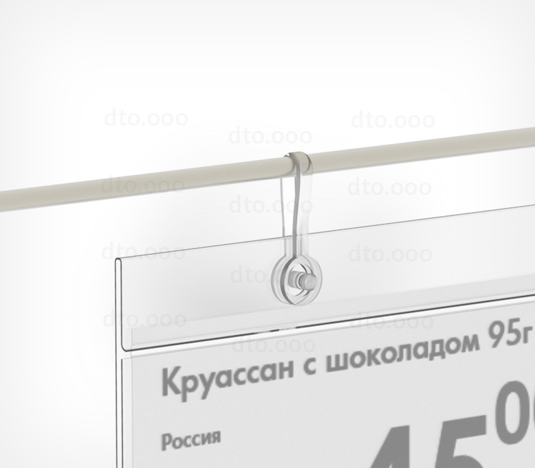 Полупрозрачная пластиковая клипса многоразового использования для крепления ценникодержателей DBH, шелфтокеров на проволочных корзинах. Длина в открытом состоянии - 50 мм.